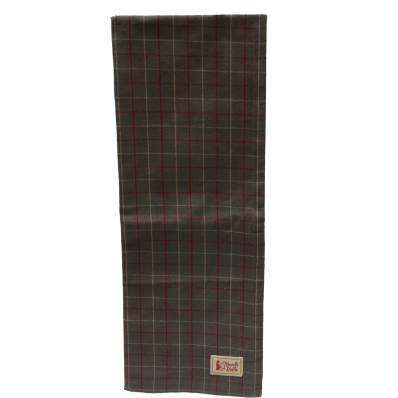 Ręcznik kuchenny z motywem kratki na szarym tle.