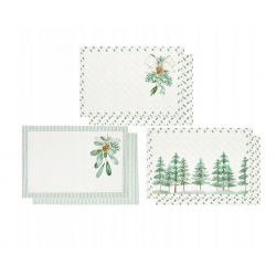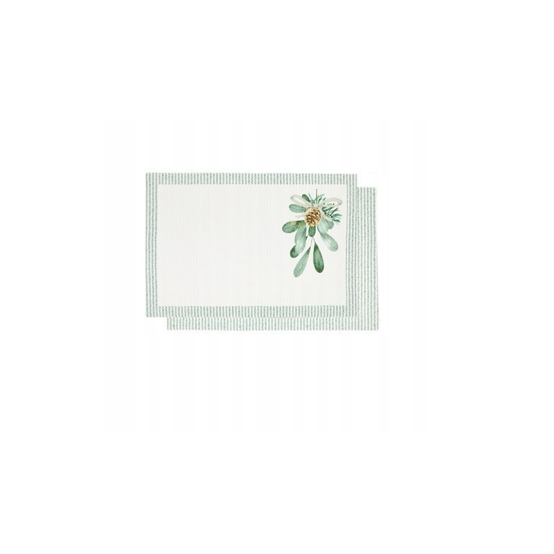 Bawełniana dwustronna podkładka na stół z motywem zielonej gałązki z szyszką i kokardką oraz zielonych kreseczek, renomowanej włoskiej firmy Pasqualetti Home Decor.