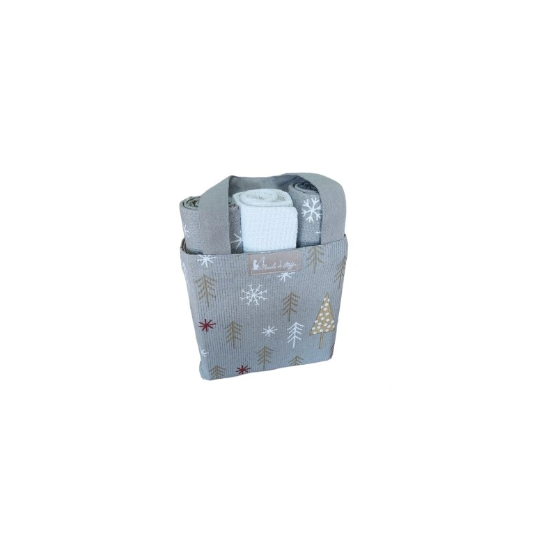 Śliczna torba materiałowa z dekoracją świąteczną- choinki, z trzema ręcznikami bawełnianymi., renomowanej włoskiej firmy Pasqualetti Home Decor.