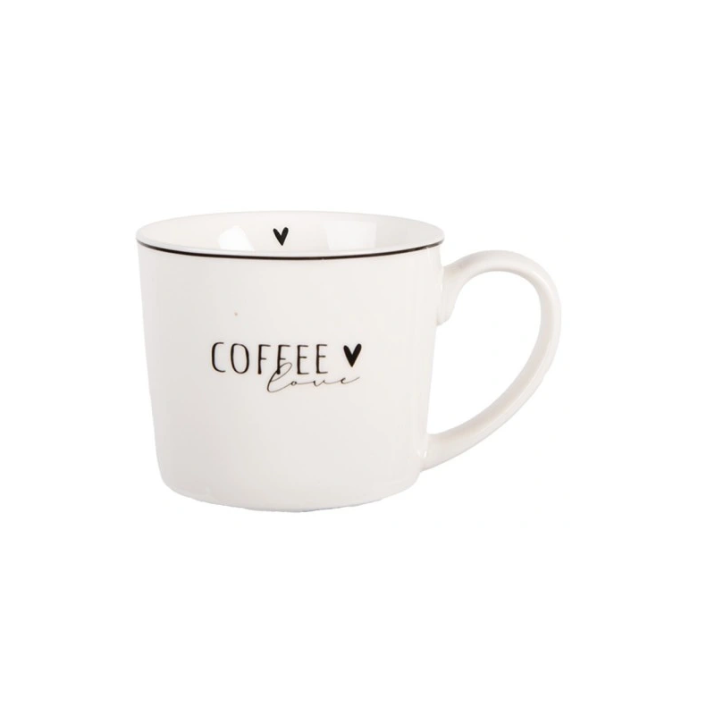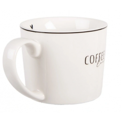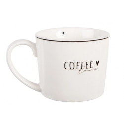 Filiżanka jest w kolorze białym z czarnym serduszkiem i napisem COFFEE LOVE.