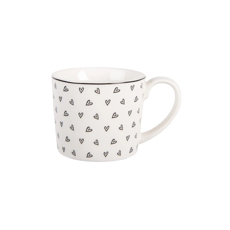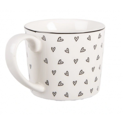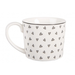 Filiżanka jest w kolorze białym w czarne serduszka.