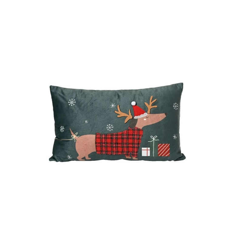 Świąteczna poduszka z wypełnieniem z motywem psa -jamnika w zimowym ubranku , renomowanej niemieckiej firmy Kaemingk.