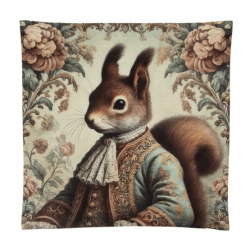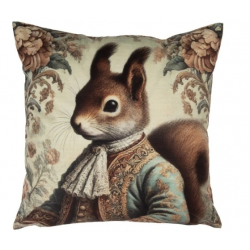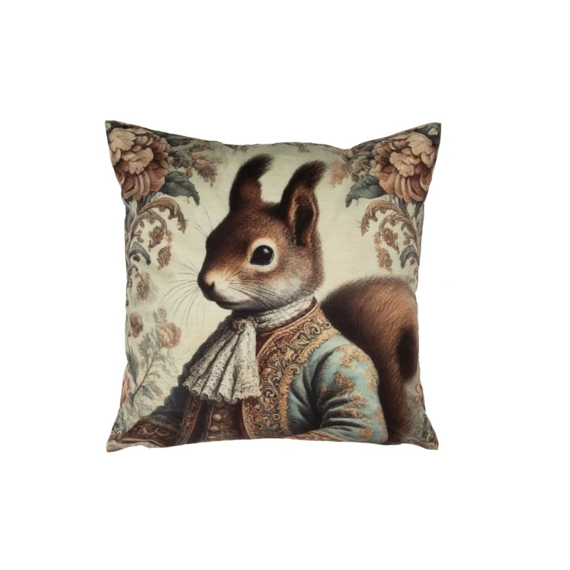 Beżowa poszewka na poduszkę z motywem odświętnie ubranej wiewiórki, produkt renomowanej holenderskiej firmy Clayre & Eef.