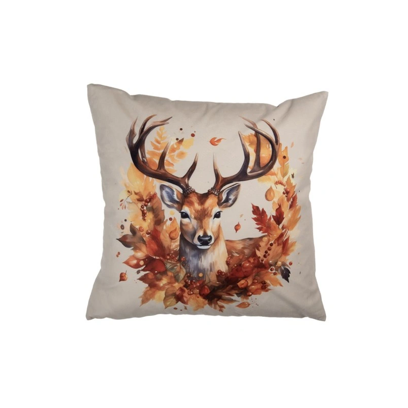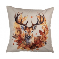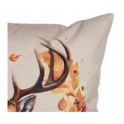 Beżowa poszewka na poduszkę z motywem Jelenia w kolorowych jesiennych liściach, produkt renomowanej holenderskiej firmy Clayre & Eef.