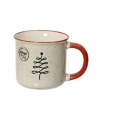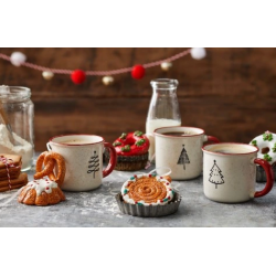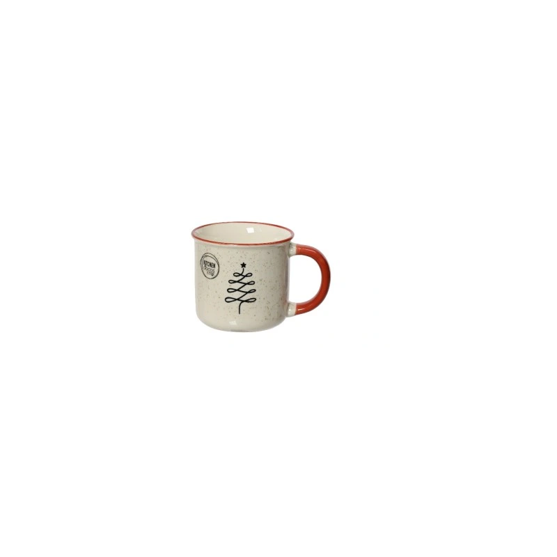 Biały kubek z czerwonym uchem z motywem choinki, renomowanej niemieckiej firmy Kaemingk.