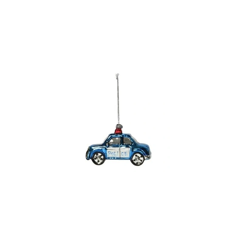 Zawieszka/ ozdoba szklana bombka w kształcie auta policyjnego w kolorze niebieskim, renomowanej niemieckiej firmy Kaemingk.