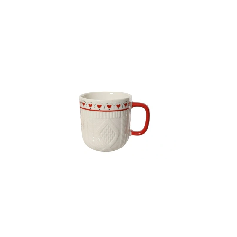 Biały kubek z czerwonym uchem z motywem Tricot i serduszek, renomowanej niemieckiej firmy Kaemingk.