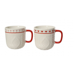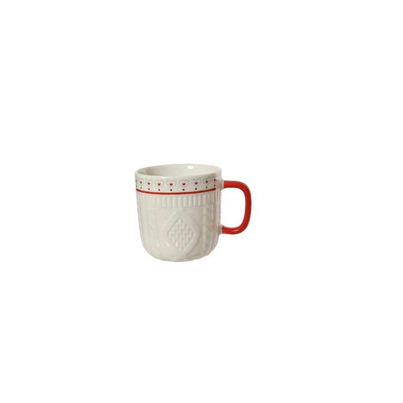 Biały kubek z czerwonym uchem z motywem Tricot małymi serduszkami, renomowanej niemieckiej firmy Kaemingk.