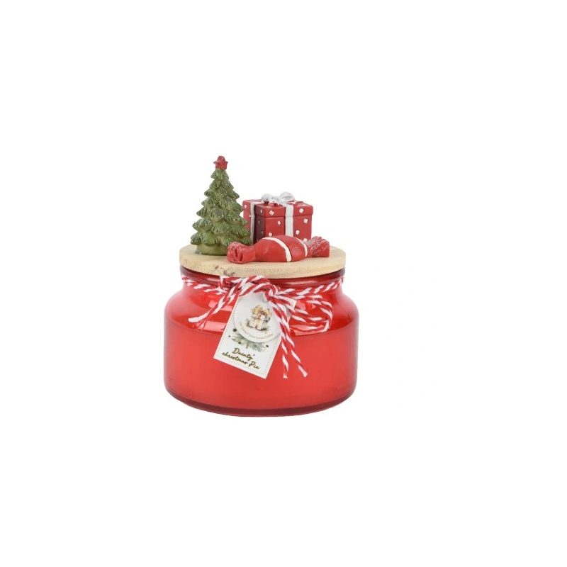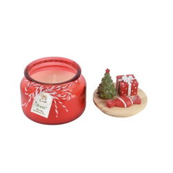 Świeczka parafinowa w czerwonym szkle z motywem świątecznym na wieczku jak równiez na szkle, renomowanej niemieckiej firmy Kaemingk.