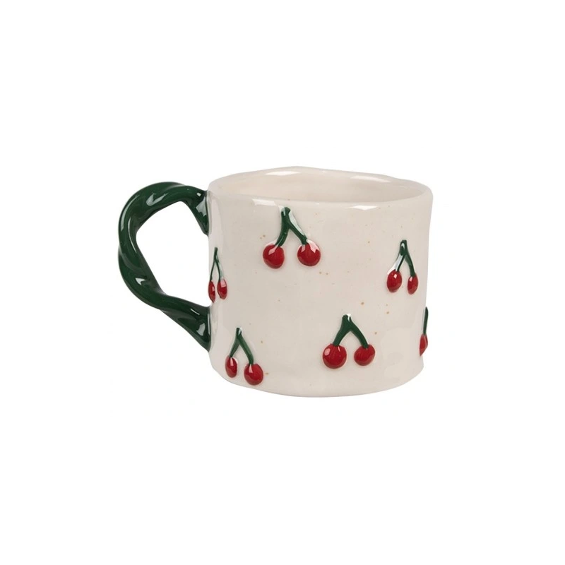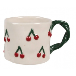 Filiżanka jest w kolorze beżowym z motywem czerwonych wisienek.