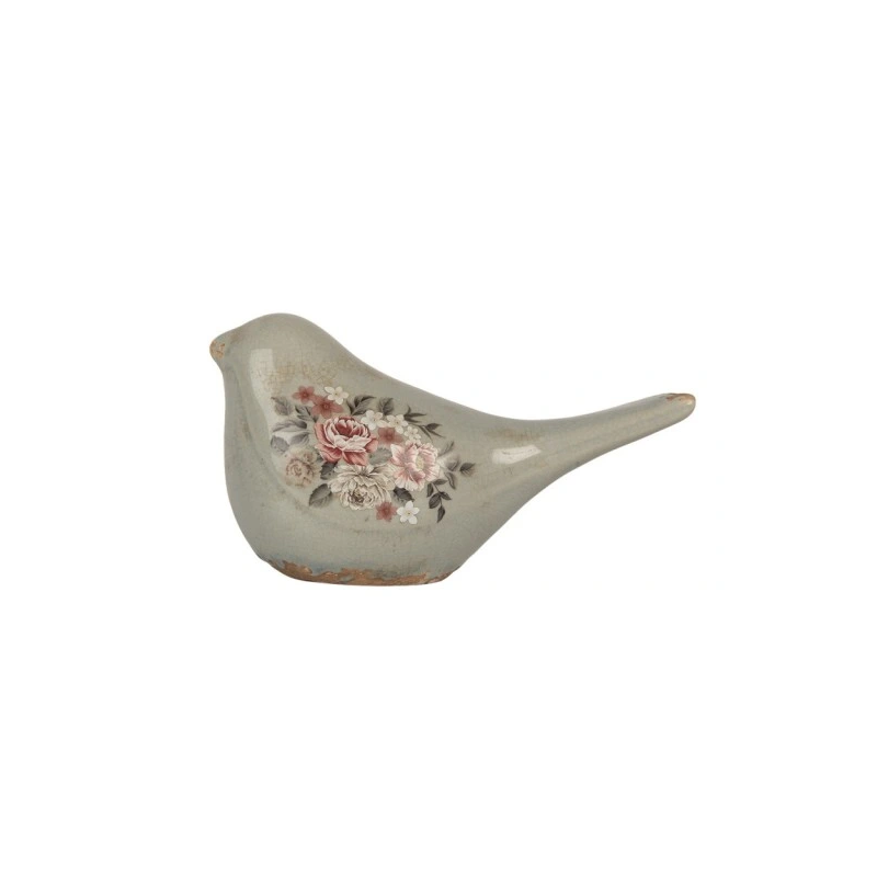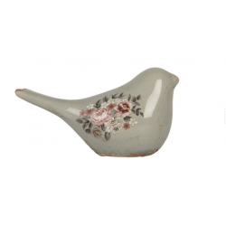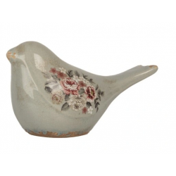 Figurka to ceramiczny ptaszek w kolorze szarym ozdobiona delikatnym motywem kwiatowym w kolorze delikatnego różu.