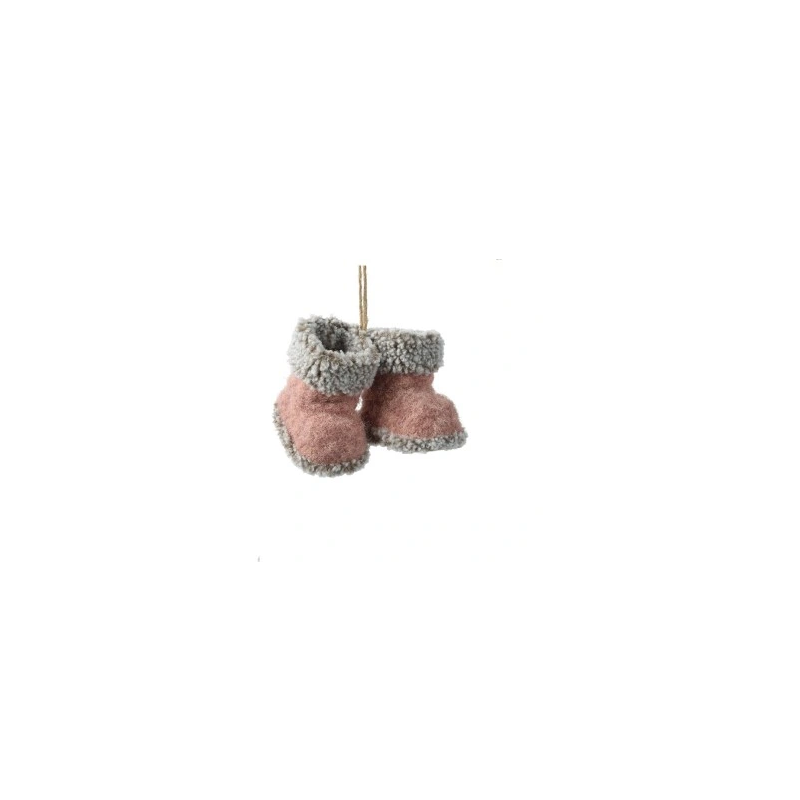 Zawieszka/ ozdoba z poliestru w kształcie bucika w ciemnoróżowym kolorze i szarym futerku, renomowanej niemieckiej firmy Kaemingk.