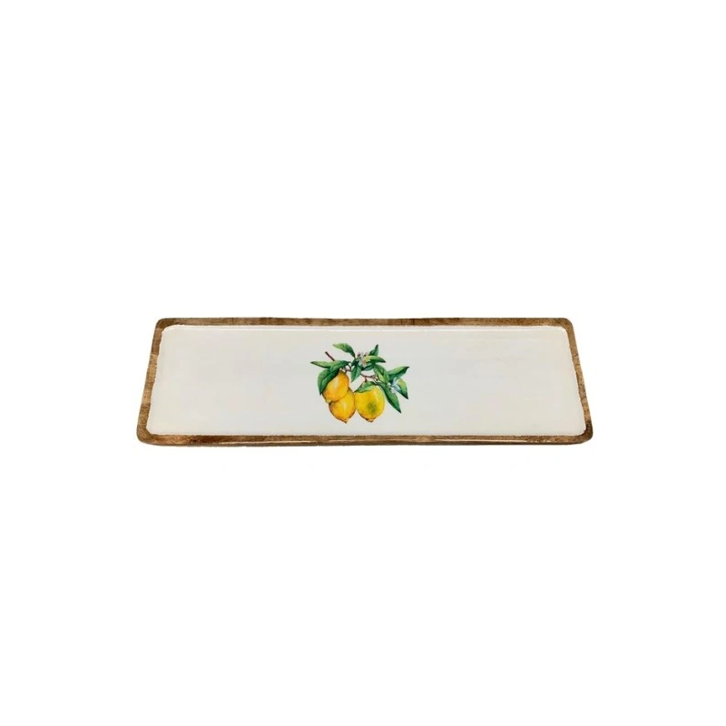Drewniana, podłużna tacka dekoracyjna z motywem cytryn, renomowanej niemieckiej firmy Exner.