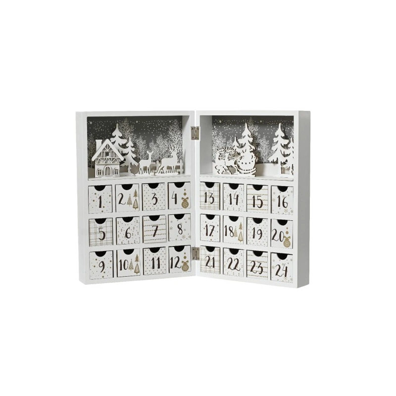Odliczaj dni do Bożego Narodzenia z tym adwentowym kalendarzem w kolorze białym z piękną zimową scenerią. Ten drewniany kalendarz o wysokości 30 cm ma 24 ponumerowane szufladki, z których każda czeka na wypełnienie słodyczami, drobiazgami lub serdecznymi niespodziankami.