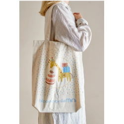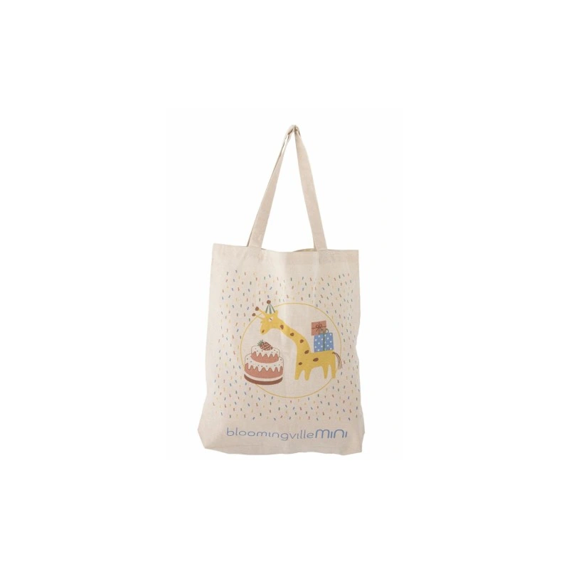 Torba Celebrate marki Bloomingville MINI jest wykonana z bawełny i przedstawia wesołą żyrafę z tortem urodzinowym i prezentami. Idealna na krótkie wypady lub do przechowywania zabawek.