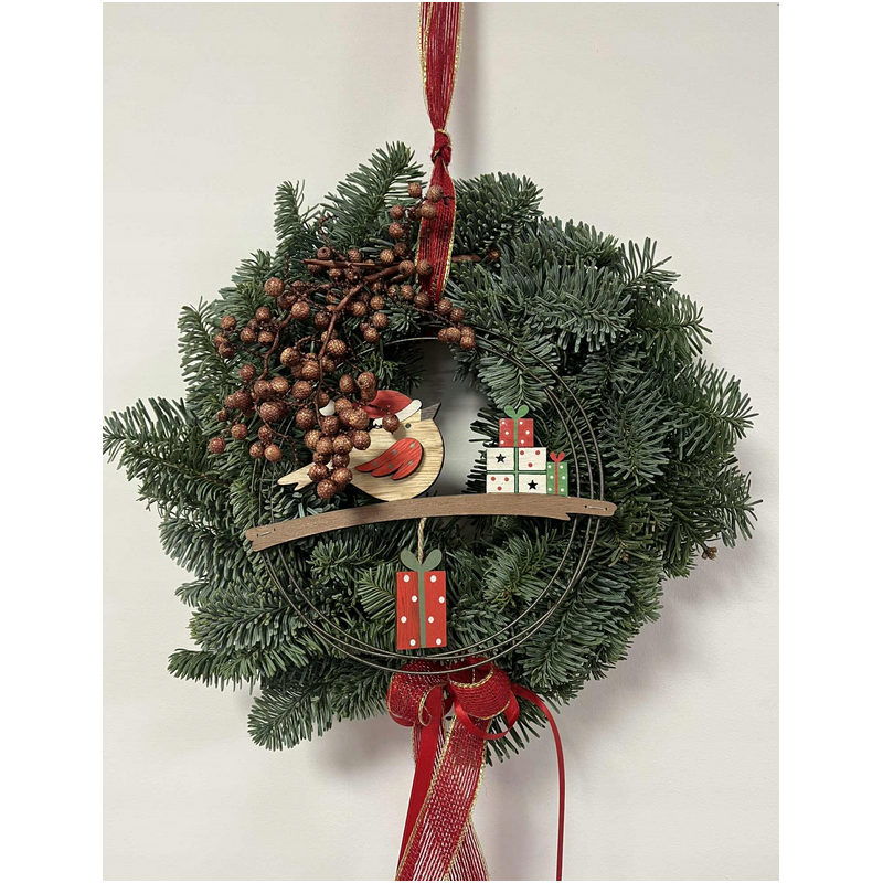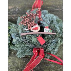 Wianek upleciony z gałązek jodły nobilis, na podkładzie słomianym. Wianek idealny do powieszenia na drzwi, ściany w domu lub położenia na stół lub komodę. Wianek ozdobiony jest elementami naturalnymi i sztucznymi. Całość ozdobiona wstążeczką. Wianek jest produktem naturalnym, gałązki zasychają i mogą się kruszyć.