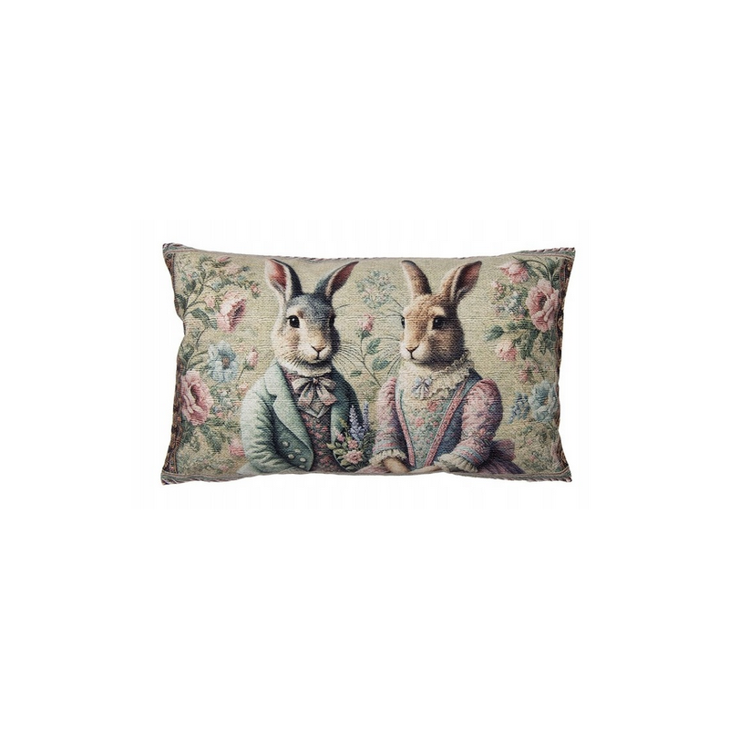 Beżowa poszewka na poduszkę z motywem kwiatów i zajączków, produkt renomowanej holenderskiej firmy Clayre & Eef.