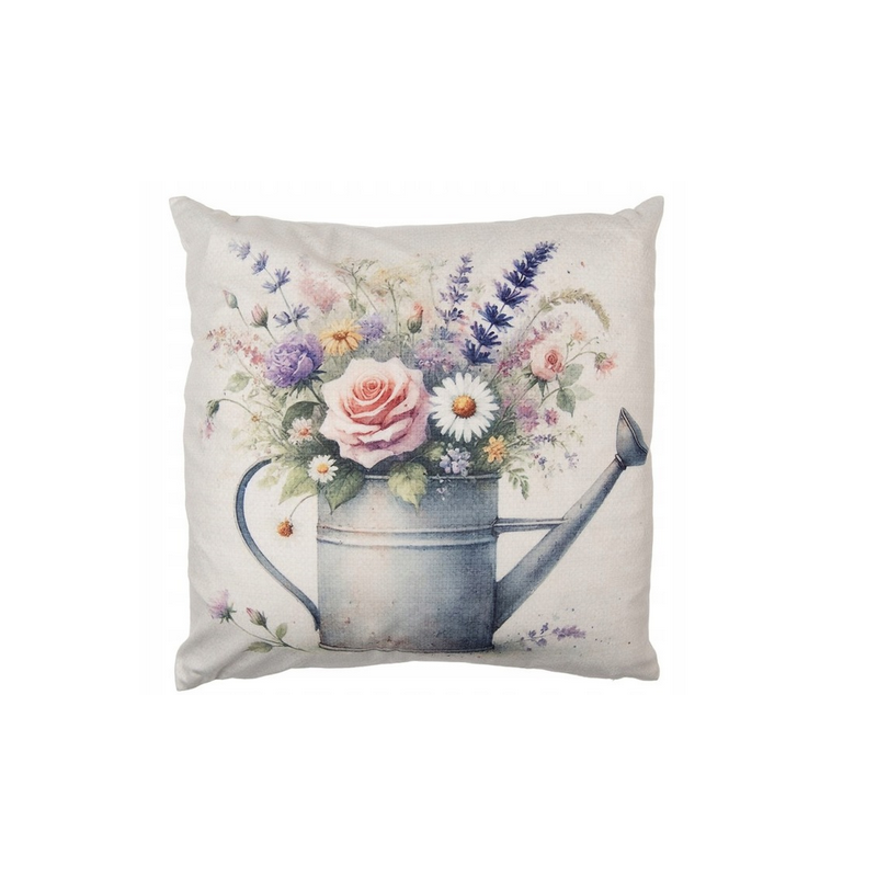 Beżowa poszewka na poduszkę z motywem konewki wypełnionej kolorowymi kwiatami, produkt renomowanej holenderskiej firmy Clayre & Eef.