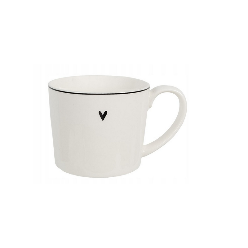 Filiżanka jest w kolorze białym z czarnym sercem.