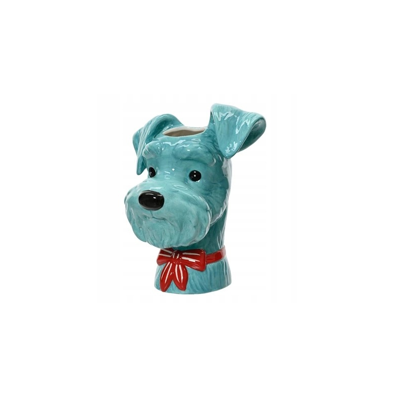 Wazon kamionkowy w kształcie głowy pieska w kolorze niebieskim z czerwoną kokardką , renomowanej firmy Kaemingk.