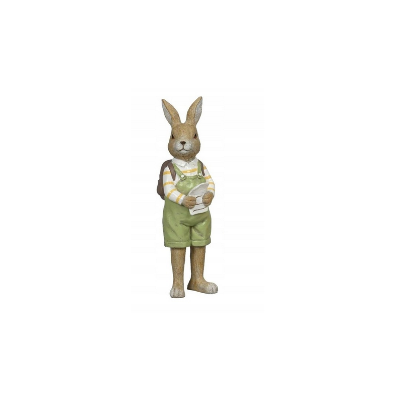 Urocza figurka dekoracyjna przedstawiająca brązowego królika w zielonych spodenkach i plecakiem. Idealna również jako dekoracja wielkanocna.