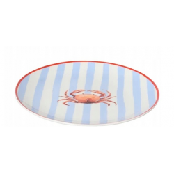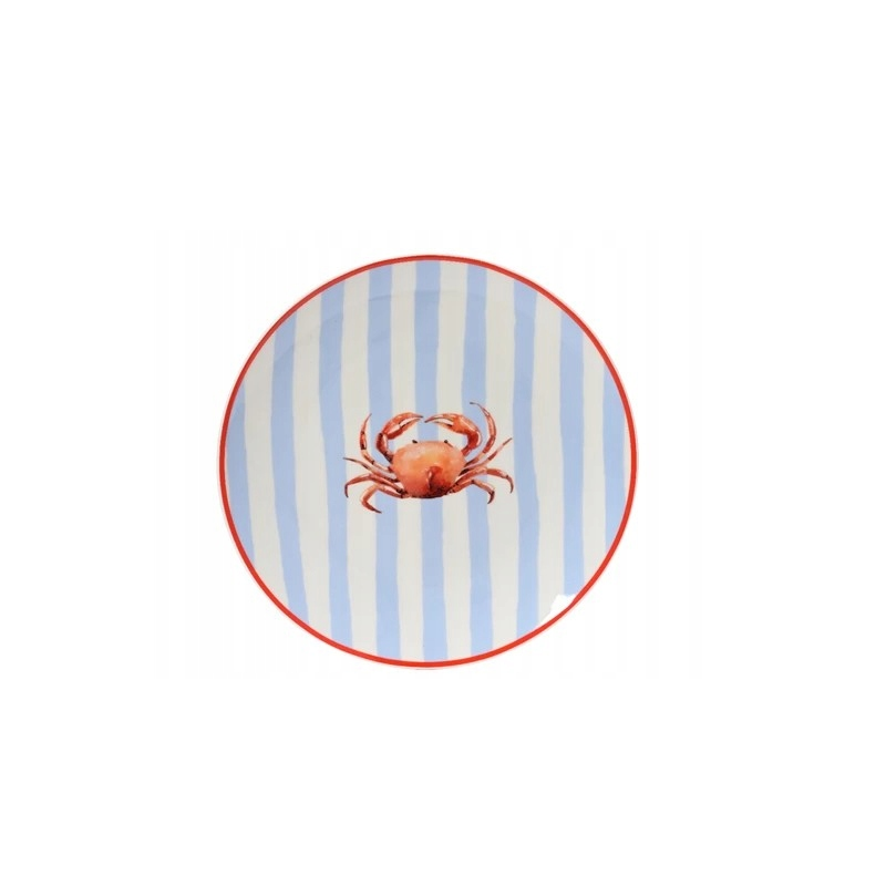 Talerz śniadaniowy biały w niebieskie paski i z motywem kraba na środku talerzyka , renomowanej niemieckiej firmy Kaemingk.