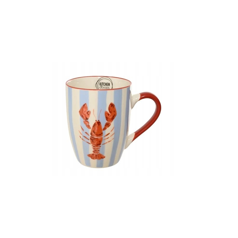 Biały kubek w kolorowe paski i z motywem czerwonego homara, renomowanej niemieckiej firmy Kaemingk.