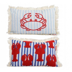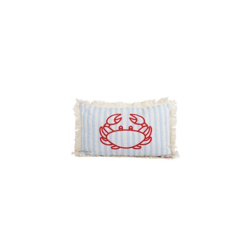 Biała poduszka z wypełnieniem w błękitne paski z motywem kraba na środku, renomowanej niemieckiej firmy Kaemingk.