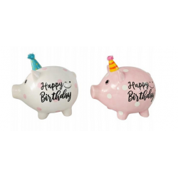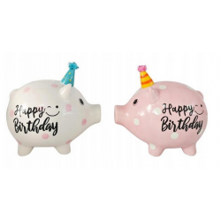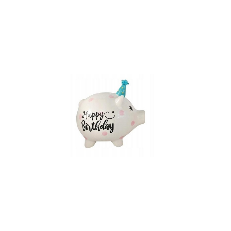 Skarbonka w kształcie świnki w kolorze białym w różowe kropki i napisem HAPPY BIRTHDAY, renomowanej niemieckiej firmy Exner.
