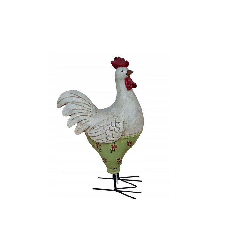 Figurka biały kogut z czerwonym grzebieniem i w zielonych spodenkach, renomowanej niemieckiej firmy Posiwio.
