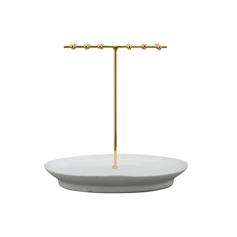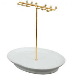 Stojak na biżuterię z białym porcelanowym talerzykiem i wieszaczkami w kolorze złotym, renomowanej niemieckiej firmy Exner.