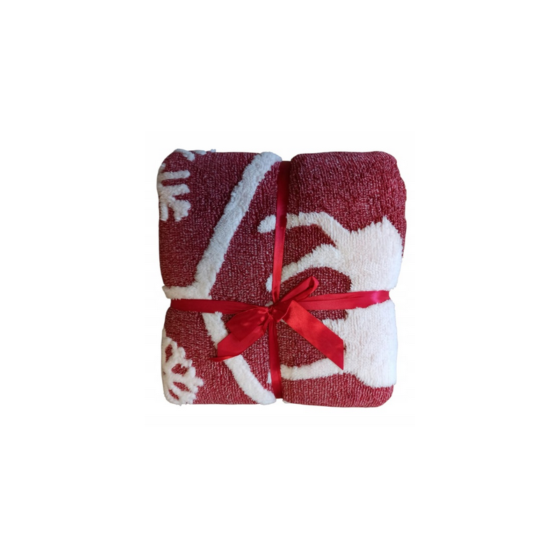 Koc w odcieniach koloru czerwonego i białego z motywem płatków śniegu i reniferów, renomowanej firmy Lemetex.