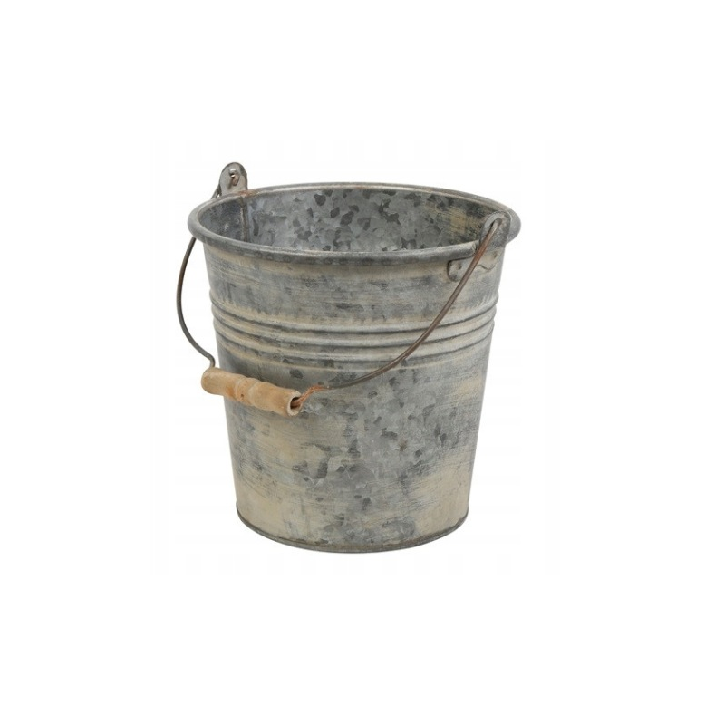 Cynkowe wiaderko w kolorze szarym z uchwytem i drewnianą rączką, renomowanej holenderskiej firmy Decostar.